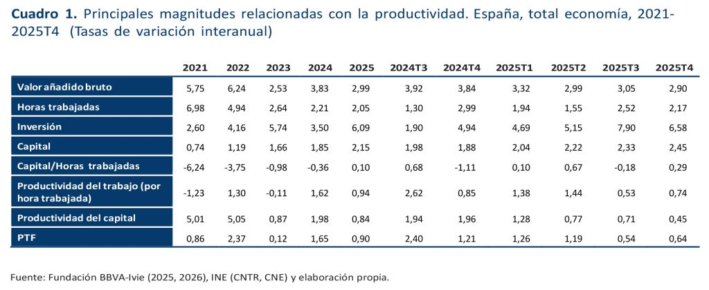 - Los datos de este rastreador incorporan el último trimestre de 2025, por lo que ya es posible analizar el comportamiento de la productividad en el conjunto de este año. La mejora de la PTF se ha ralentizado respecto a 2024, aunque sigue siendo positiva y se sitúa cerca del 1% en promedio anual. La productividad del trabajo y del capital también muestran tasas de variación positivas en 2025 (0,94% y 0,84%), aunque también se observa cierta moderación en su crecimiento si se compara con 2024.