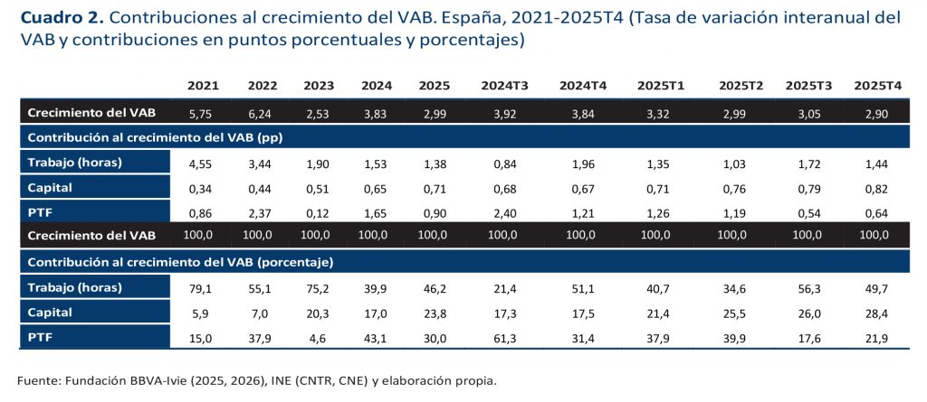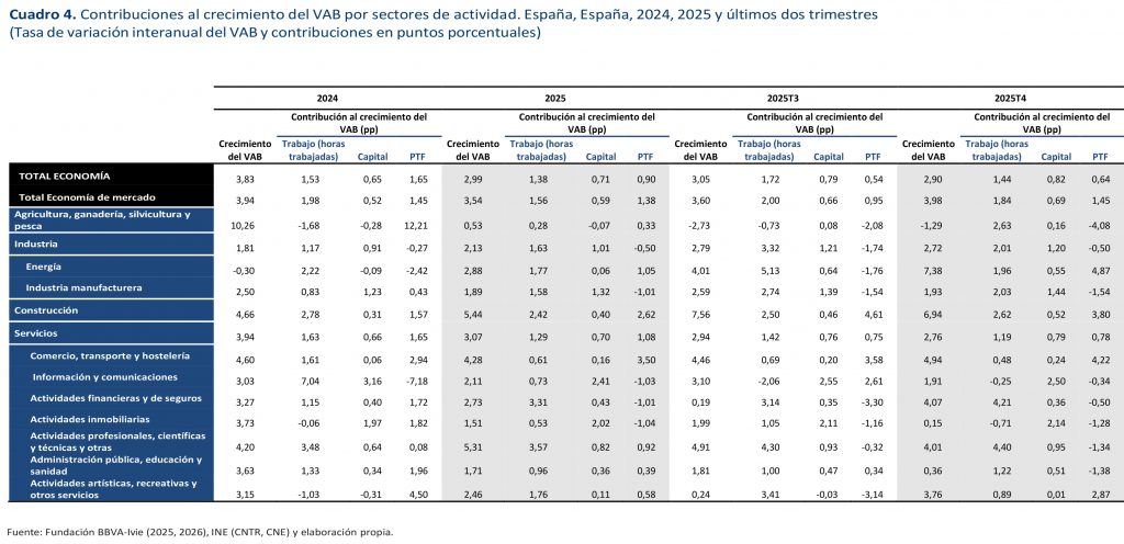 Casi la mitad (el 49,7%) del elevado crecimiento del PIB del cuarto trimestre de 2025 (2,9%) se debe al aumento del empleo (horas trabajadas). El capital aumenta su contribución (28,4%) gracias a la aceleración de la inversión (6,6%). Por su parte, la contribución de la PTF se desacelera con respecto a 2024 y los dos primeros trimestres de 2025, aunque continúa siendo positiva (21,9%). - El intenso crecimiento de los factores hace que la productividad del trabajo (por hora trabajada) se desacelere en el último trimestre si se compara con la de 2024 o la primera mitad de 2025, creciendo solo un 0,7% en términos interanuales. Lo mismo sucede con la productividad del capital, que crece por debajo del 0,5% interanual. En el caso de la productividad del trabajo y de la PTF, se estabiliza la reducción de la productividad observada en el segundo semestre del año.