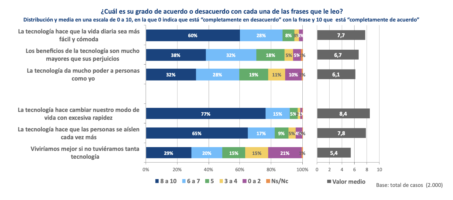 Los ciudadanos hacen un balance global positivo de los beneficios de la tecnología, si bien expresan también algunas reservas. En efecto, hay un amplio consenso sobre la contribución de la tecnología a la comodidad y facilidad de la vida actual (7,7), al mismo tiempo que señalan que “hace cambiar nuestro modo de vida con excesiva rapidez” (8,4) y hace que las personas “se aíslen cada vez más” (7,8). Las opiniones están más divididas respecto a la idea de que “viviríamos mejor sin tanta tecnología” (5,4), pero en todo caso la mayoría considera que “los beneficios de la tecnología son mucho mayores que sus prejuicios” (6,7).