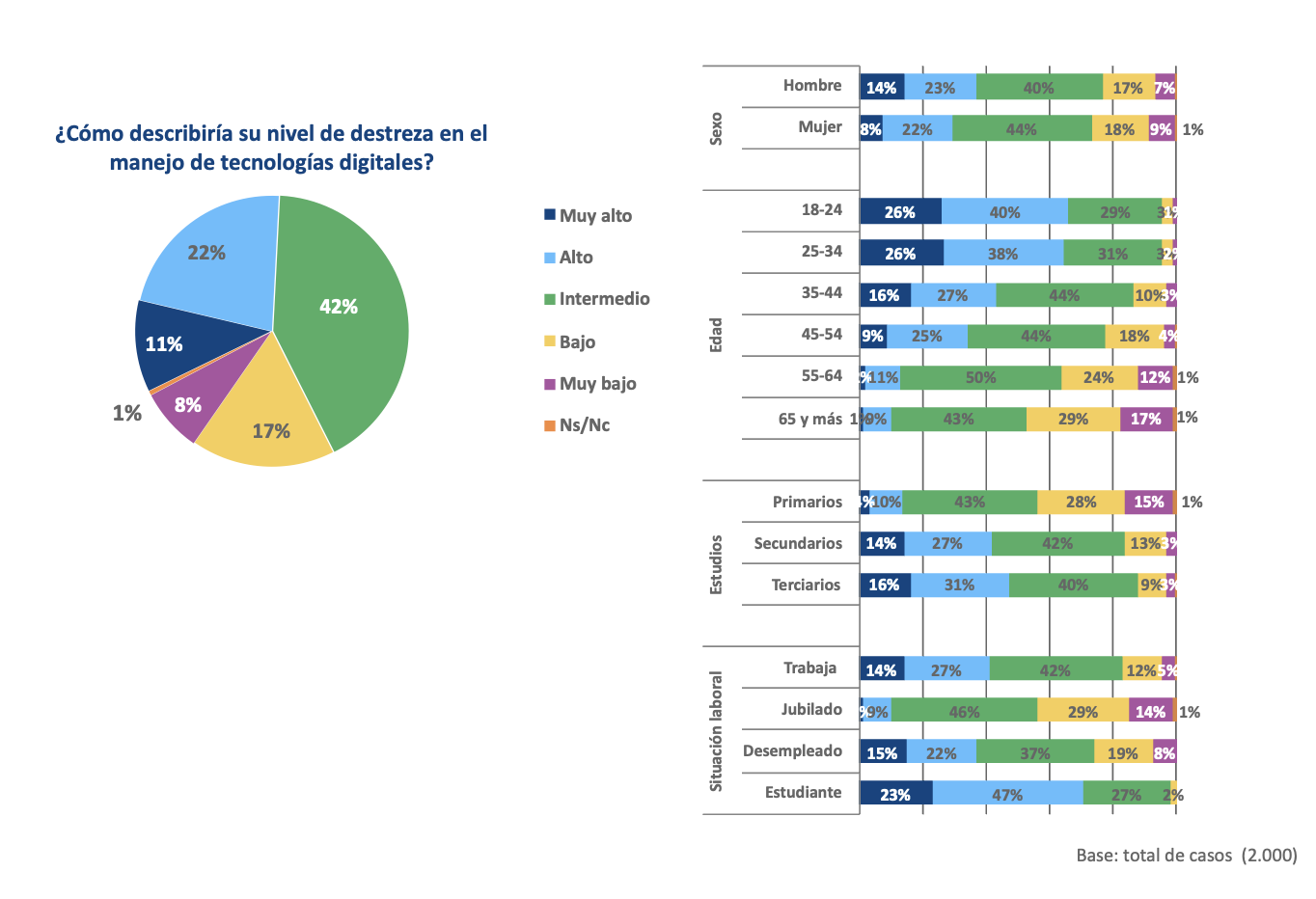 La autopercepción del nivel de destreza en el manejo de tecnologías digitales es muy desigual entre los españoles: la mayoría relativa (42%) se sitúa en una posición intermedia, frente a un 33% que declara un nivel muy alto o alto y un 25% que se sitúa en el otro extremo, con un nivel de competencia bajo o muy bajo.