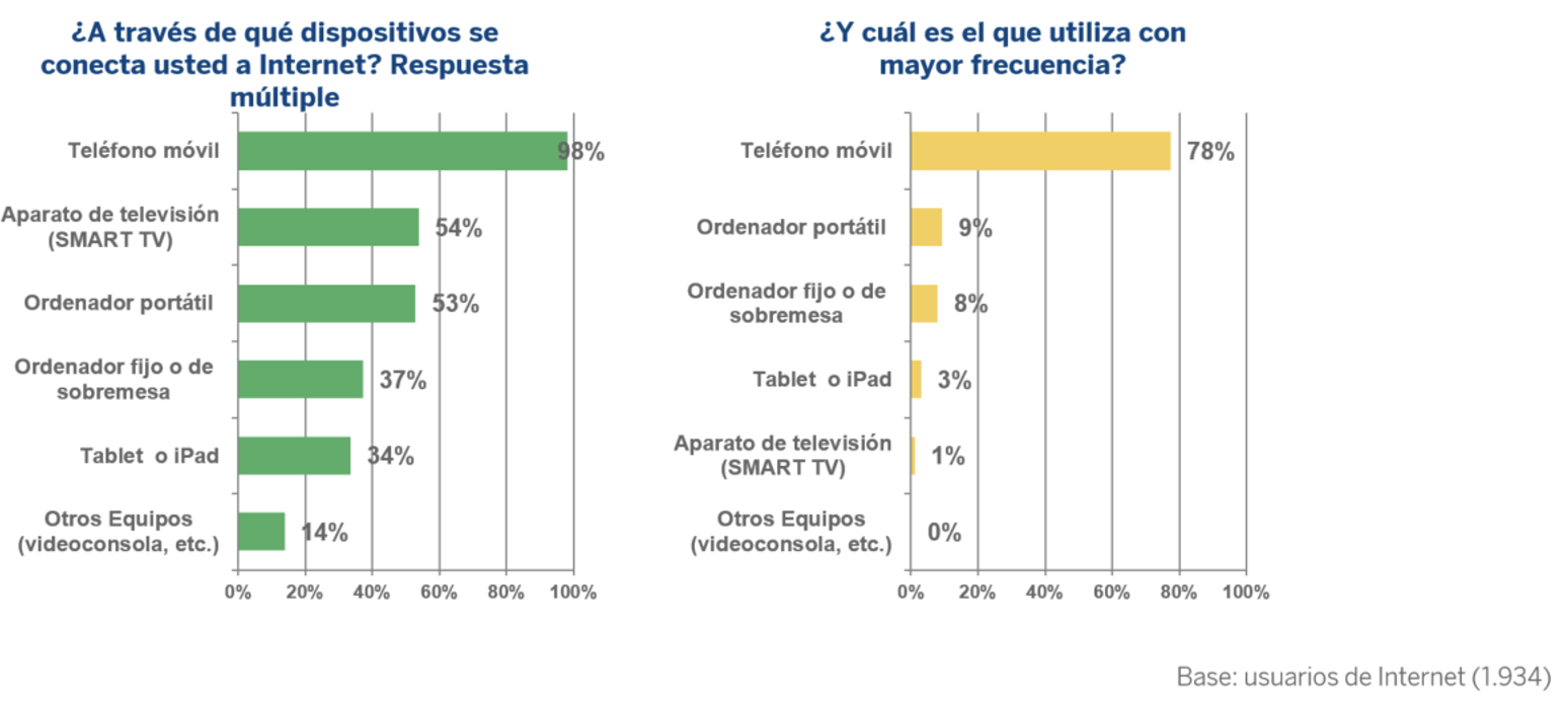 Prácticamente la totalidad de la población se conecta a Internet a través del teléfono móvil (el 98%), más de la mitad lo hace también desde el televisor (54%) y el ordenador portátil (53%), y más de un tercio utiliza el ordenador de sobremesa (37%) y la tablet o iPad (34%). En todo caso, el predominio del móvil es absoluto: para el 78% de los españoles se ha convertido en el dispositivo de uso más frecuente para acceder a la red, a una gran distancia respecto al ordenador portátil (9%), el ordenador fijo (8%) y la tableta (3%).
