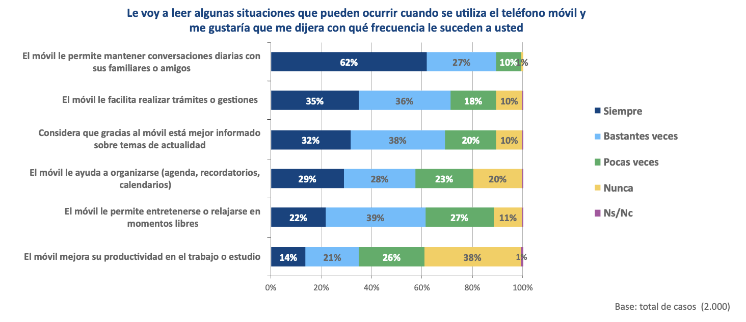 La mayoría de los ciudadanos considera el móvil fundamentalmente como una herramienta que le permite comunicarse con sus familiares y amigos. Con un amplio consenso, pero de forma más moderada, se destaca el potencial de este dispositivo para realizar gestiones, informarse, organizarse y entretenerse, mientras que son una minoría quienes consideran que mejora la productividad laboral o académica.