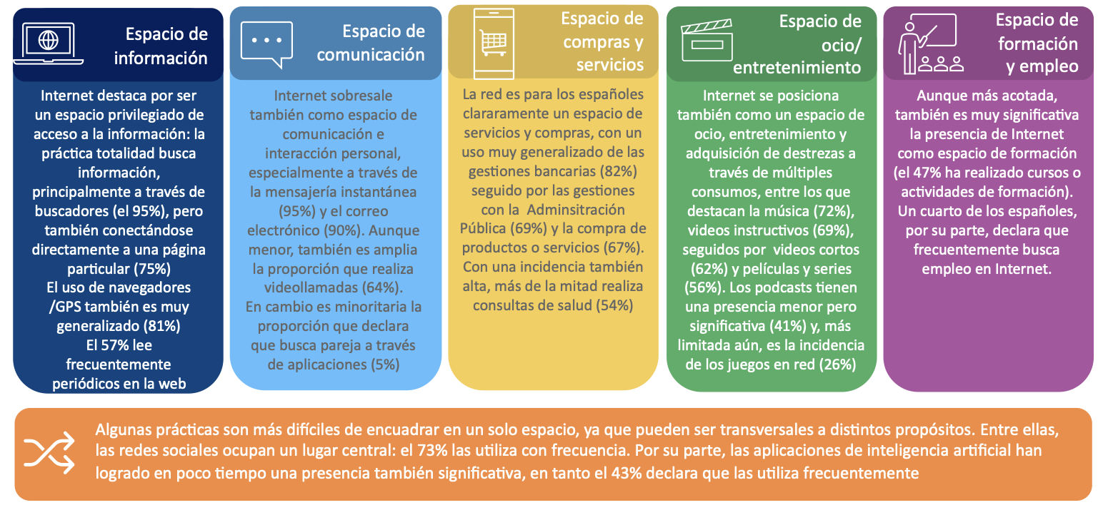 Los resultados de esta investigación documentan la plena integración de Internet en la vida cotidiana de la población española, y el predominio del móvil como principal centro de coordinación de sus actividades en el espacio digital. Prácticamente la totalidad de los ciudadanos se conectan a la red a través del móvil y dedican más tiempo a navegar por la web, chatear por aplicaciones de mensajería y usar las redes sociales que a realizar llamadas. La conexión diaria es casi universal y el entorno digital se ha consolidado como un espacio de uso intensivo y polivalente, en el que confluyen de manera habitual prácticas de información, comunicación, ocio, formación y gestión de asuntos personales.