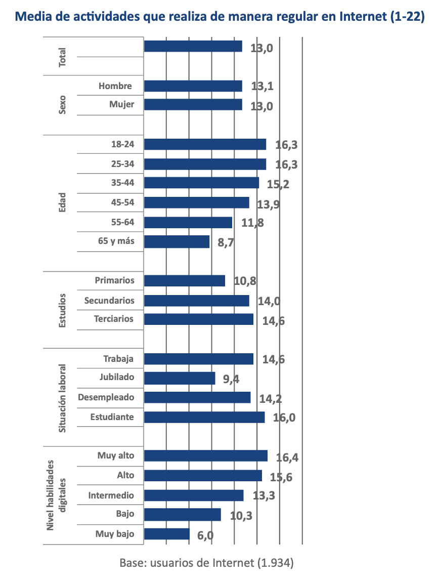 La conexión prácticamente universal a la red no se traduce en un uso uniforme de la misma; la cantidad y diversidad de usos es muy desigual entre segmentos. El promedio de actividades que realizan regularmente los españoles en Internet es de 13 (sobre una lista de 22 actividades consideradas en el estudio). Este valor medio aumenta notablemente entre los jóvenes y adultos jóvenes, conforme se incrementa el nivel de estudios, entre quienes trabajan y, más aún, entre quienes estudian. El promedio de actividades que se llevan a cabo en Internet está correlacionado con la autopercepción de competencias digitales, ascendiendo a 16 prácticas entre quienes declaran un nivel muy alto de competencia y descendiendo a 6 entre los que perciben su nivel como muy bajo.