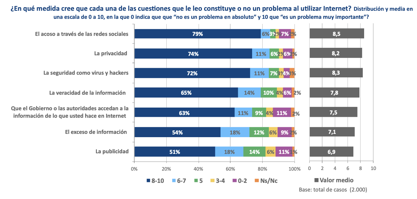 Junto a la extensión y diversidad de usos de Internet, la población española identifica claramente un conjunto de problemáticas asociadas al entorno digital. Una amplia mayoría percibe como problemas muy importantes de Internet el acoso a través de las redes sociales (media de 8,5 en una escala de 0 a 10 en la que 0 indica que “no es un problema en absoluto” y 10 que “es un problemas muy importante”), la privacidad (8,2) y amenazas a la seguridad como virus y hackers (8,3). A estas inquietudes se suman las relacionadas con la veracidad de la información (7,8), el acceso a la información sobre lo que se hace en Internet por parte del Gobierno o las autoridades (7,5), el exceso de información (7,1) y la publicidad (6,9).