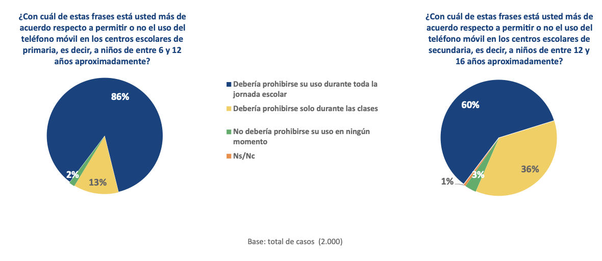 Existe un amplio consenso social a favor de restringir el uso de teléfonos móviles en los centros escolares, aunque con diferencias significativas entre primaria y secundaria. Así, casi nueve de cada diez españoles apoyan la prohibición total en primaria, y se reduce a seis de cada diez en el caso de secundaria. Apenas supera el 10% quienes se muestran algo más flexibles a su uso en horario no lectivo en primaria y alrededor de un tercio en secundaria.
