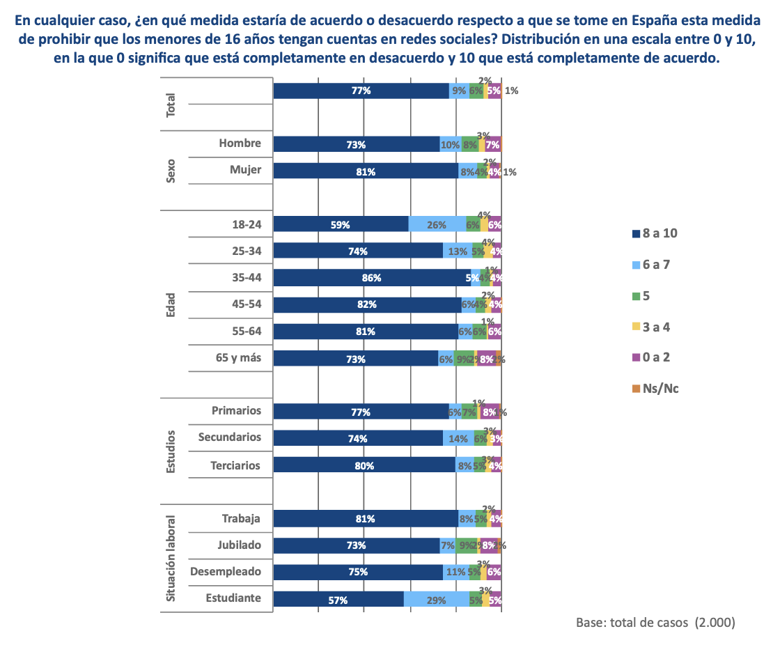 Otro de los ejes visibles del debate actual es el acceso de niños y adolescentes a las redes sociales. El trabajo de campo de este estudio se realizó tras conocerse la decisión del Gobierno de Australia de prohibir el acceso a las redes sociales a los menores de 16 años y se comprobó, en primer lugar, que una amplia mayoría (70%) había escuchado o leído información sobre esta medida. Al preguntar por el grado de acuerdo con la aprobación de esta misma medida en España, un 77% se sitúa en el extremo de máximo acuerdo (8 a 10 en una escala de 0 a 10) y de estos un 60% en el 10. Este amplio respaldo social es trasversal a todos los segmentos, aunque son los más jóvenes y los estudiantes, grupo más cercano a la población hipotética que se vería afectada directamente por la medida, quienes se muestran menos inclinados a que se aplique esta medida.