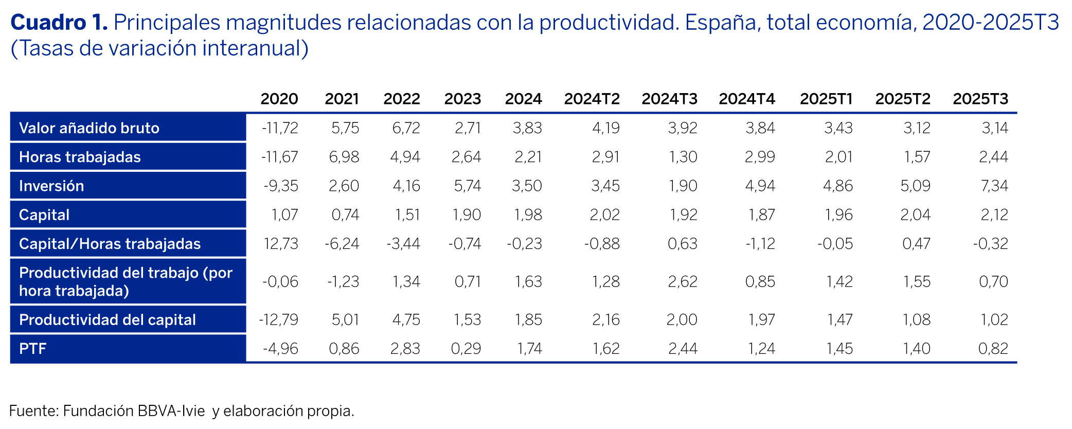 A diferencia de las décadas anteriores, el crecimiento combina la creación de empleo y la acumulación de capital con el aumento de la productividad, lo que implica un cambio en el patrón de crecimiento. El empleo (horas trabajadas, en términos desestacionalizados) ha seguido creciendo con intensidad, a una tasa interanual cercana al 2,5%. El comportamiento de la inversión todavía ha sido más destacado ya que, tras la última revisión del INE, crece por encima del 4,8% en los dos primeros trimestres de 2025, llegando al 7,3% en el tercer trimestre. Se superan ampliamente las tasas de crecimiento de la inversión observadas en 2024. Este vigoroso aumento de la inversión ha sostenido el crecimiento del stock de capital, que se ha situado alrededor del 2% en los últimos trimestres. El crecimiento del capital es sensiblemente menor que el de la inversión pues el primero no depende solo de la inversión corriente, sino de todas las inversiones pasadas todavía no amortizadas.
