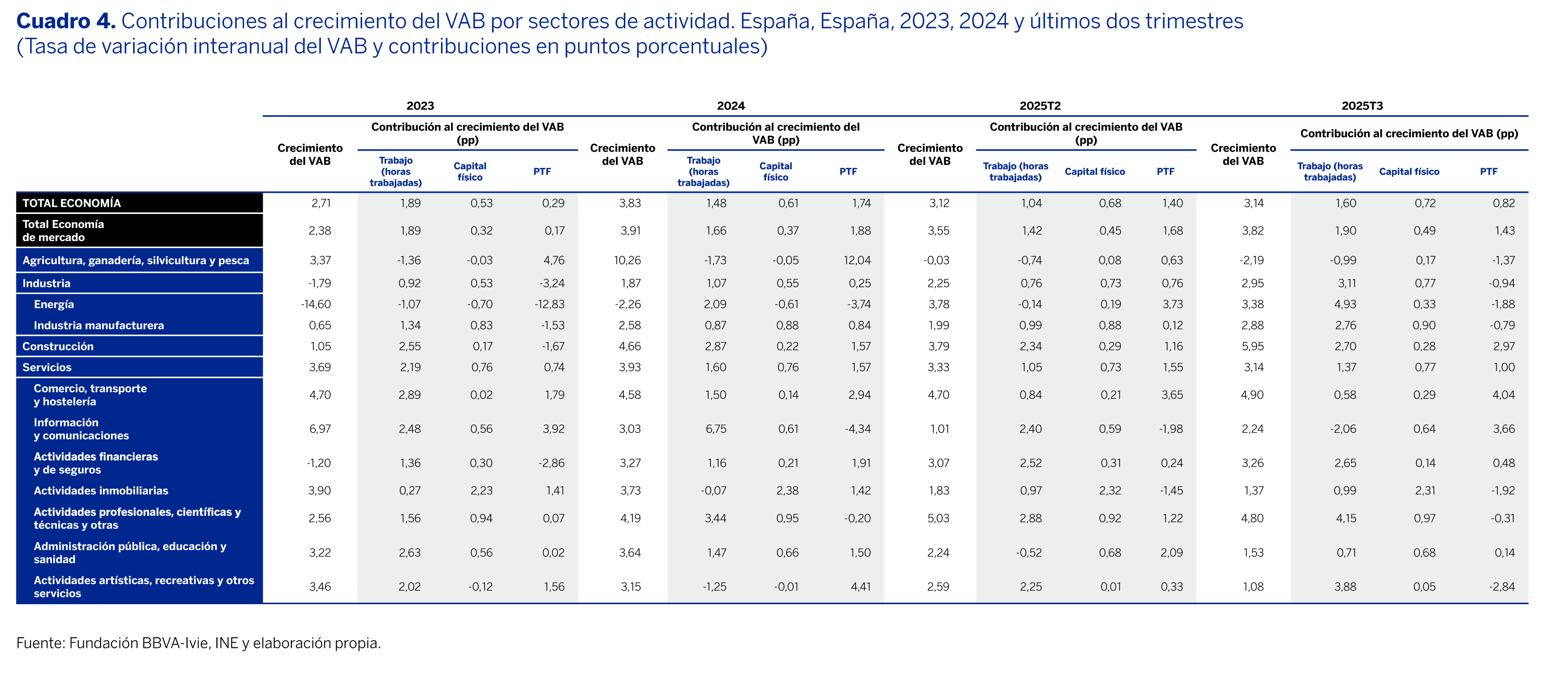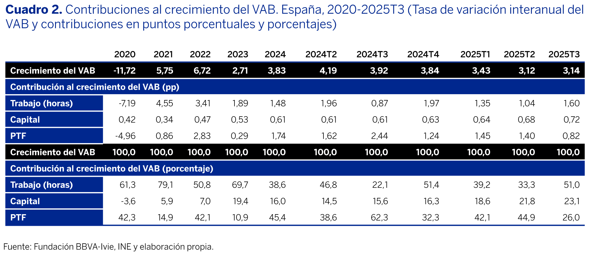 Si se descompone la variación anual del VAB en las contribuciones del capital, el trabajo y la PTF, el crecimiento del valor añadido en España entre el tercer trimestre de 2025 y de 2024 se debe fundamentalmente a la acumulación de factores productivos (74%), y en menor medida a ganancias de productividad (PTF) (26%). Así, en el tercer trimestre de 2025, del crecimiento interanual del VAB del 3,1%, 1,6 puntos porcentuales (pp) se deben a la aportación del trabajo (el 51% de la variación total del VAB), mientras las mejoras en las dotaciones de capital y de la PTF tuvieron una contribución similar, 0,7 y 0,8 pp respectivamente (el 23% y el 26% de la variación del VAB). Este tercer trimestre de 2025 se observa una reducción importante de la contribución de la PTF con respecto al tercer trimestre de 2024. Es decir, se modera la dinámica virtuosa de 2024 y de los primeros dos trimestres de 2025, cuya principal fuente de crecimiento era la mejora de la eficiencia, contribuyendo con más del 40%.
