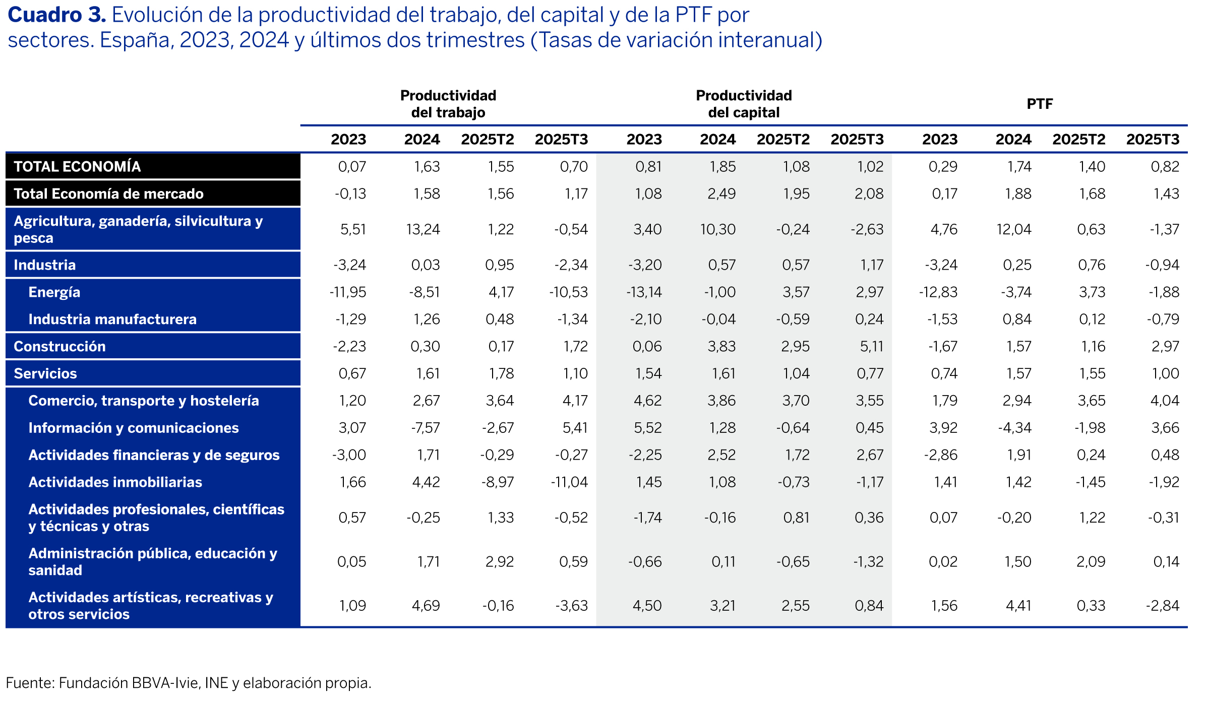 Se observan también diferencias notables entre sectores en la dinámica de la productividad. La productividad de la economía de mercado crece más que la del conjunto de la economía (cuadro 3), al igual que en los trimestres anteriores. La productividad del trabajo de la economía de mercado ha aumentado un 1,2% en el tercer trimestre de 2025, mientras la del capital ha aumentado un 2,1% y la PTF un 1,4%. Respecto al segundo trimestre de 2025, la productividad del capital se ha acelerado, mientras que en la del trabajo y la PTF sucede lo contrario y su crecimiento se reduce. En cualquier caso, el comportamiento en el último trimestre muestra un crecimiento de la eficiencia productiva más lento si se compara con el conjunto de 2024. Este año la productividad del capital en la economía de mercado creció un 2,5%, mientras que la del trabajo y la PTF aumentaron un 1,6% y 1,9%, respectivamente.